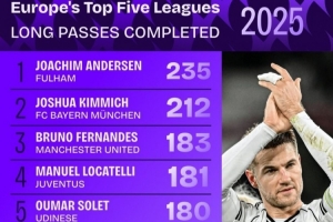 體育資訊1月1日訊 2025年已經(jīng)結(jié)束,數(shù)據(jù)機(jī)構(gòu)squawka也統(tǒng)計(jì)了2025年成功長(zhǎng)傳情況,富勒姆的后衛(wèi)安諾森領(lǐng)跑。