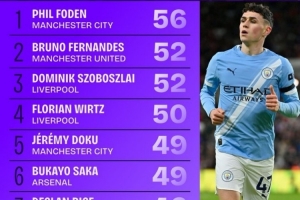 體育資訊1月6日訊 Squawka統(tǒng)計(jì)了英超球員本賽季各項(xiàng)賽事創(chuàng)造機(jī)會Top10,福登56次居首。