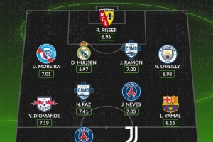 中場:帕斯(科莫,7.41分)、若昂·內維斯(巴黎圣日耳曼,7.05分)、揚·迪奧曼德(萊比錫紅牛,7.19分)、亞馬爾(巴塞羅那,8.15分)
