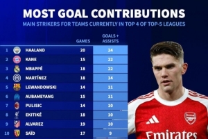 體育資訊1月9日訊 《轉會市場》統(tǒng)計了本賽季五大聯賽排名前四的球隊各自主力中鋒的參與進球情況,哈蘭德、凱恩、姆巴佩分列前三,戴維、約克雷斯、貢薩洛·拉莫斯列倒數前三。