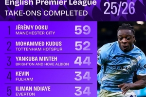 本賽季英超成功過(guò)人榜: