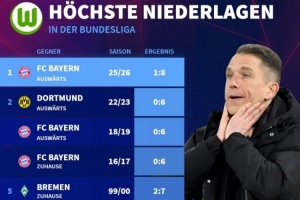 體育資訊1月12日訊 本輪德甲焦點(diǎn)戰(zhàn),狼堡在客場1-8慘敗拜仁,也創(chuàng)下了他們隊(duì)史最大比分輸球紀(jì)錄。
