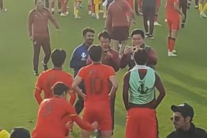 中國(guó)U23國(guó)足0-0泰國(guó)U23,實(shí)現(xiàn)U23亞洲杯歷史首次出線。賽后王鈺棟拍合影,拜合拉木趁機(jī)扒褲子,王鈺棟回頭看錯(cuò)方向。