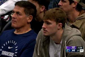本場(chǎng)比賽因左腳踝扭傷缺戰(zhàn)的弗拉格來到了現(xiàn)場(chǎng),并坐在球隊(duì)小老板庫(kù)班身邊觀看比賽。