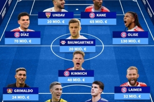 中場(chǎng):路易斯·迪亞斯(拜仁)、基米希(拜仁)、鮑姆加特納(萊比錫)、奧利塞(拜仁)