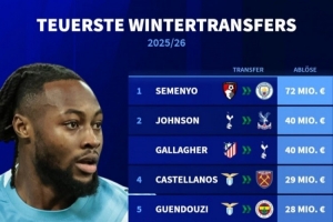 體育資訊1月17日訊 2025-26賽季冬季轉(zhuǎn)會窗已經(jīng)開啟大約半個月時間,德國轉(zhuǎn)會市場盤點了球員的轉(zhuǎn)會費情況,塞梅尼奧7200萬歐最高,布倫南·約翰遜和加拉格爾均4000萬歐并列次席。