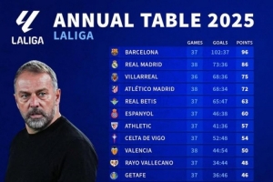 體育資訊12月28日訊 2025年即將過(guò)去,《轉(zhuǎn)會(huì)市場(chǎng)》也統(tǒng)計(jì)了2025年西甲總積分榜情況,巴薩獨(dú)自居首。