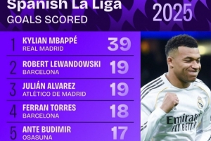 體育資訊12月30日訊 2025年接近尾聲,squawka也統(tǒng)計了本年度西甲進球情況,姆巴佩獨自斷崖領(lǐng)跑。